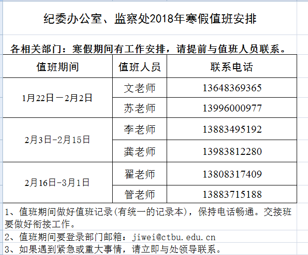 纪委办公室、监察处2018年寒假值班安排