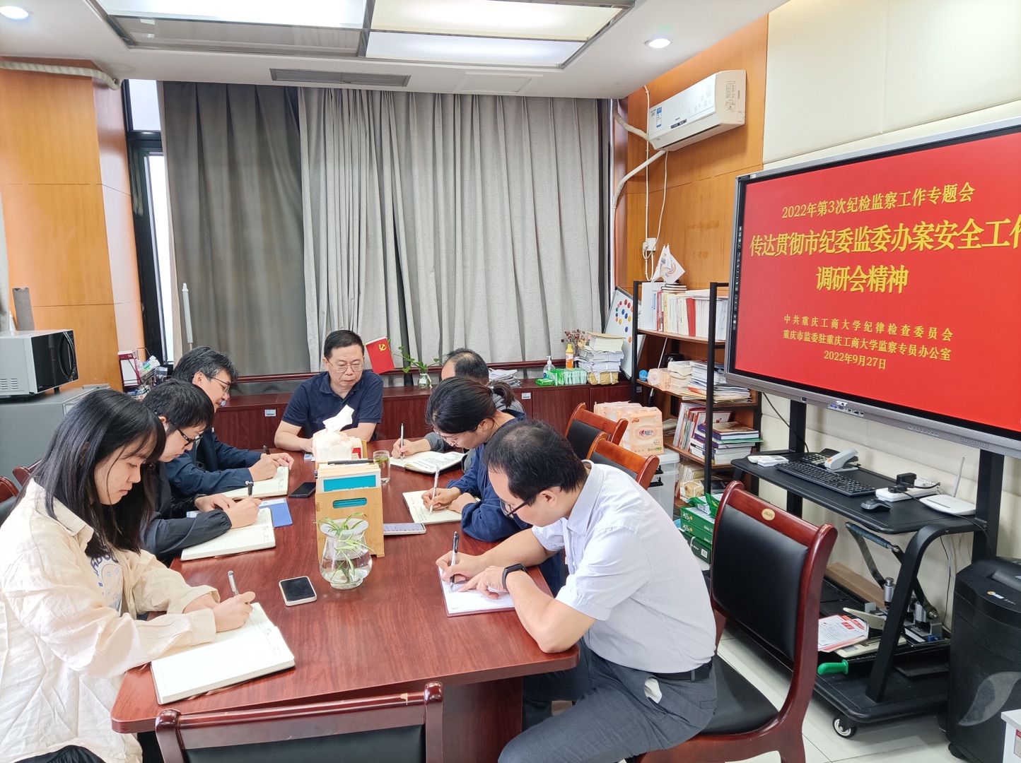 周航同志传达学习了9月26日市纪委监委办案安全工作调研会精神,就办案安全工作作了讲话并对贯彻落实调研会精神提出三点要求:一要利用纪检监察工作例会、纪检监察室室务会等,继续深入学习贯彻中央纪委国家监委、市纪委监委关于办案安全工作相关要求。二要贯彻落实市纪委监委关于办案安全工作纠治要求,切实抓好传达贯彻、学习培训、对照检视、监督检查、整改落实、总结提升。三要严格对照“五个方面”突出问题、“八个严禁”谈话纪律要求、“五个落实”谈话工作要求,结合实际情况制定办案安全工作相关方案、台账、清单等,切实做好我校办案安全工作。