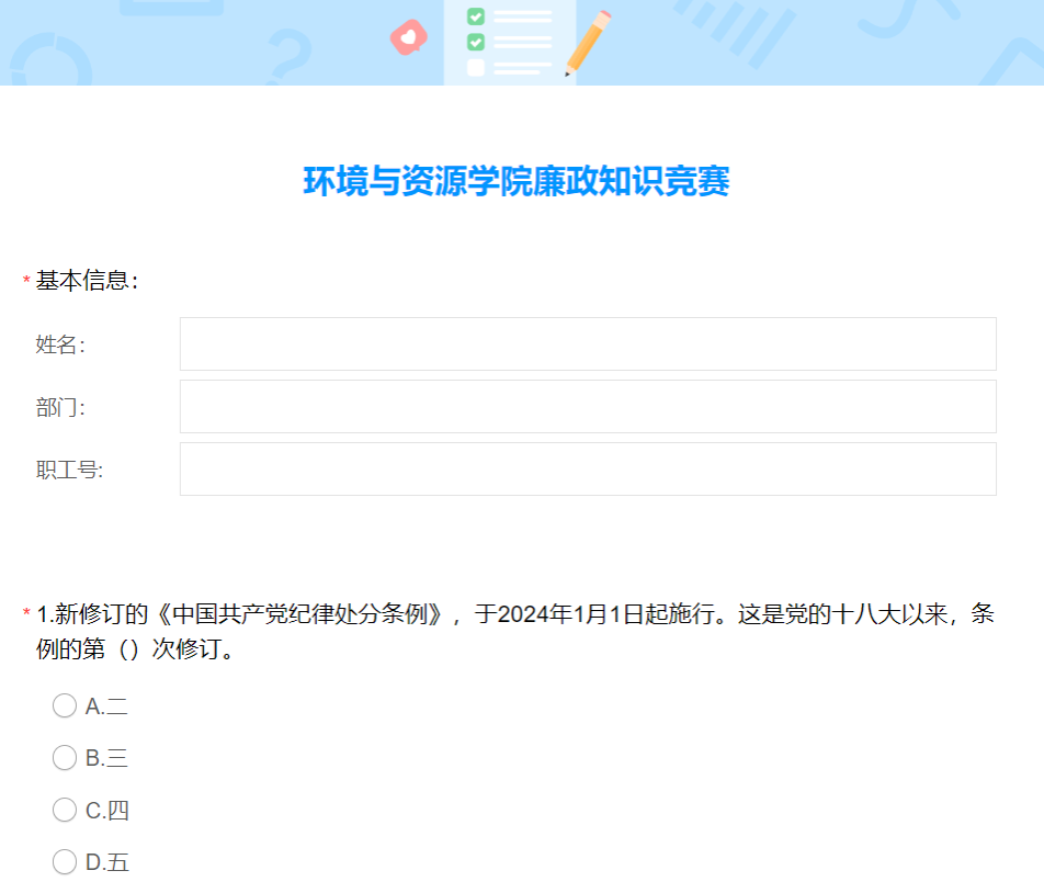 为了进一步推动廉政文化建设,增强广大师生的廉洁自律意识,提高拒腐防变能力,10月24日,环境与资源学院组织全体教职工开展了“与清风同行”廉政知识竞赛答题活动,活动形式为网络答题。
