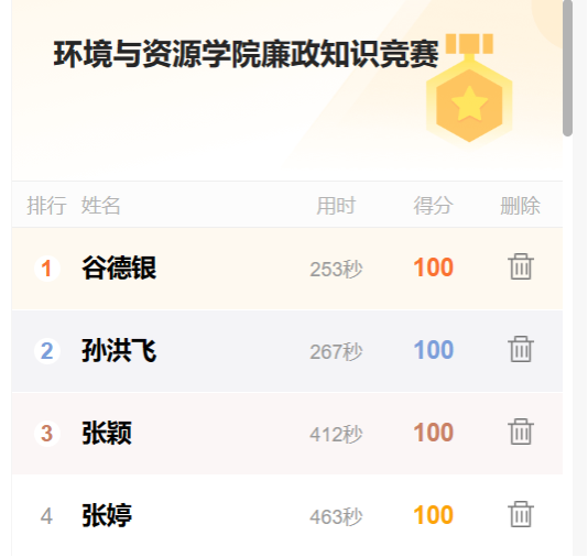 此次党风廉政知识测试内容丰富,涵盖了党的基本理论知识和《中国共产党章程》《中国共产党纪律处分条例》《关于加强新时代廉洁文化建设的意见》《中国共产党普通高等学校基层组织工作条例》等相关内容,多位参赛老师交出了满分的答卷。