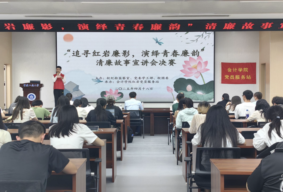 为深化党团联动机制,激活一站式学生社区党建育人动能,引领青年学子厚植廉洁底色、共筑校园清风生态,2025418日下午,校纪检监察室、党委学工部、校团委与会计学院红岩党员服务站于明德楼1019报告厅,联合举办追寻红岩廉影,演绎青春廉韵清廉故事宣讲会决赛。学校纪检监察室主任苏治远、校团委书记吴佑波、会计学院党委书记邓德敏、党委副书记郝颖,携7位参赛选手及会计学院80余名师生,共同参与这场党建+廉洁的育人实践。